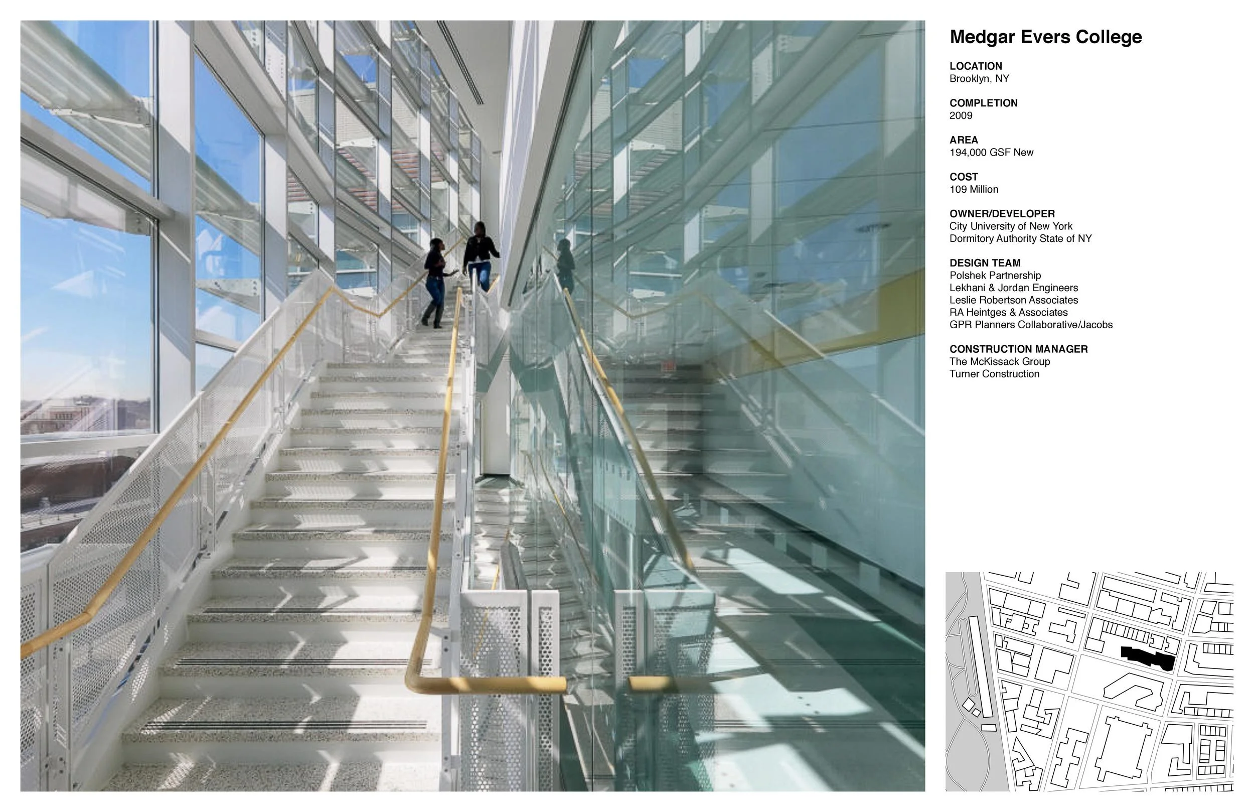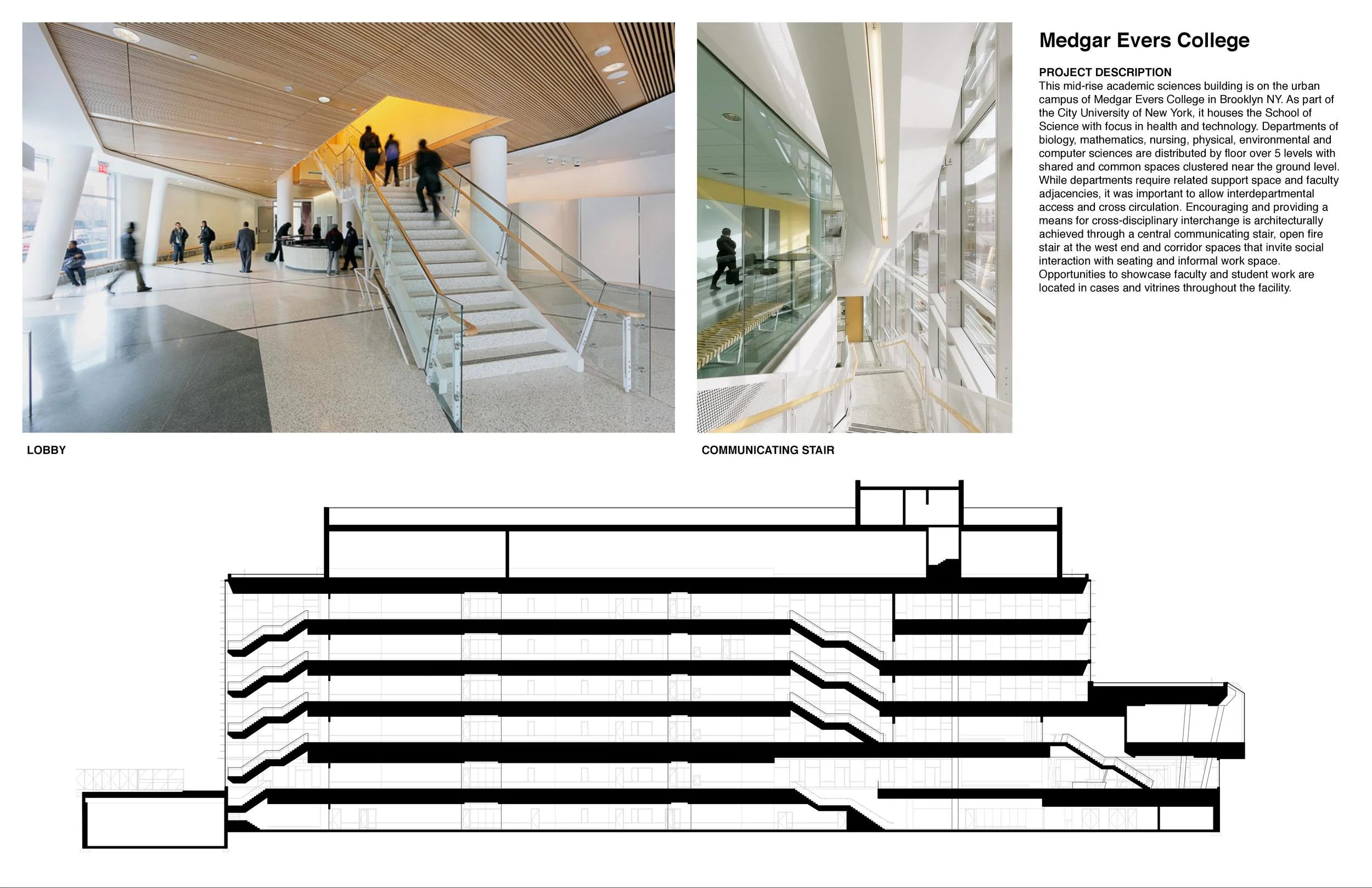 This mid-rise academic sciences building is on the urban campus of Medgar Evers College in Brooklyn, NY. As part of the City University of New York, it houses the School of Science with focus in health and technology. Departments of biology, mathematics, nursing, physical, environmental and computer sciences are distributed by floor over 5 levels with shared and common spaces clustered near the ground level.
